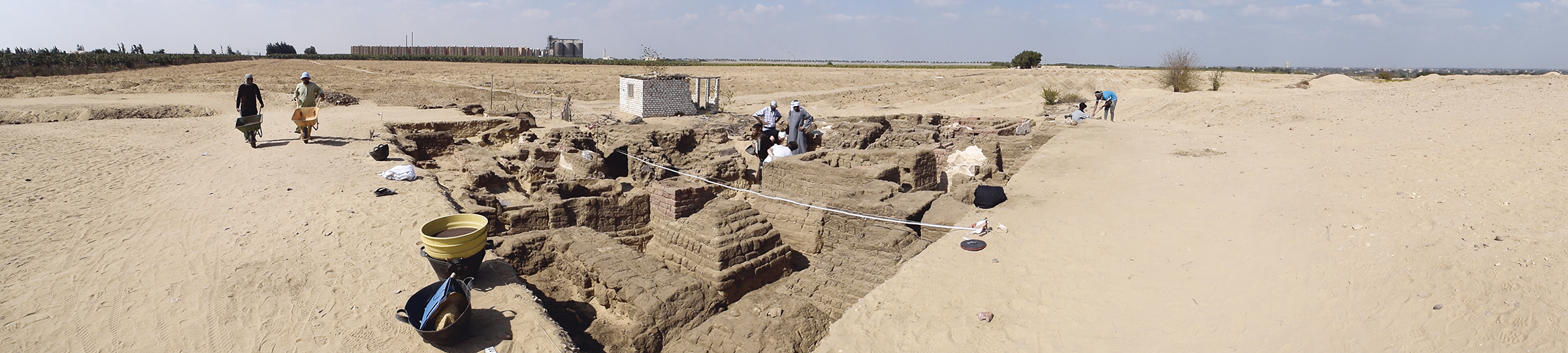 On the surface the chronological time-frame extends from the 7th century BC to the 12th century AD. The most ancient levels, indicated by ceramic material, occur on the western part of the site, due to recent weathering of the soil. Immediately to the north of this area is a mud-brick enclosure of 125 m long and 8 m thick, an exceptional size for a secondary site of the Delta. This, already located on satellite images, most likely corresponds to the temenos enclosure of Hathor, the principal goddess of the town. On each side of the canal which cuts the site in two, the residential areas are well-preserved, with walls on the surface surviving to a height of several metres. These were the subject of the first excavations in 2017. The first observations indicate that this belonged to the Imperial Roman and Byzantine town.