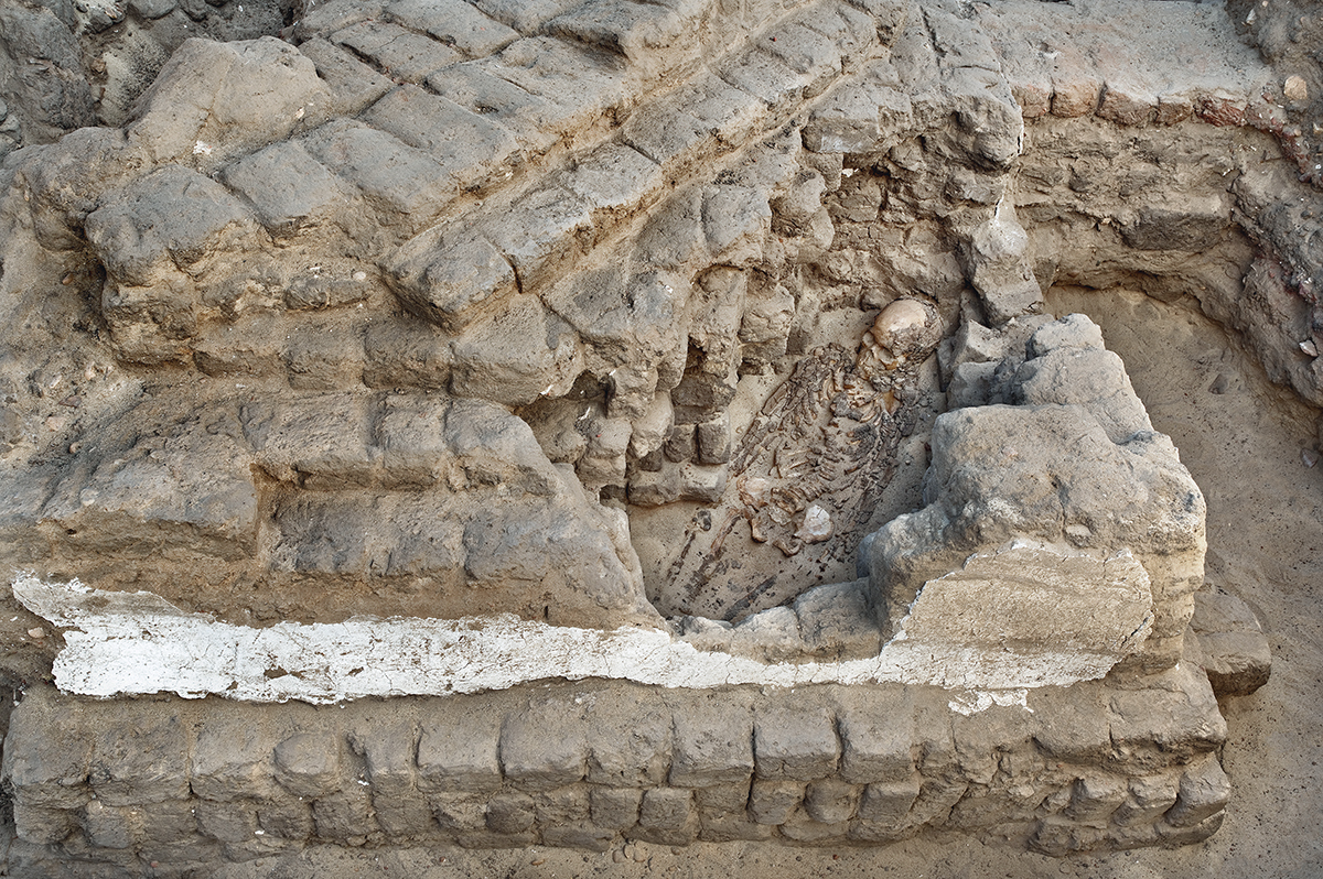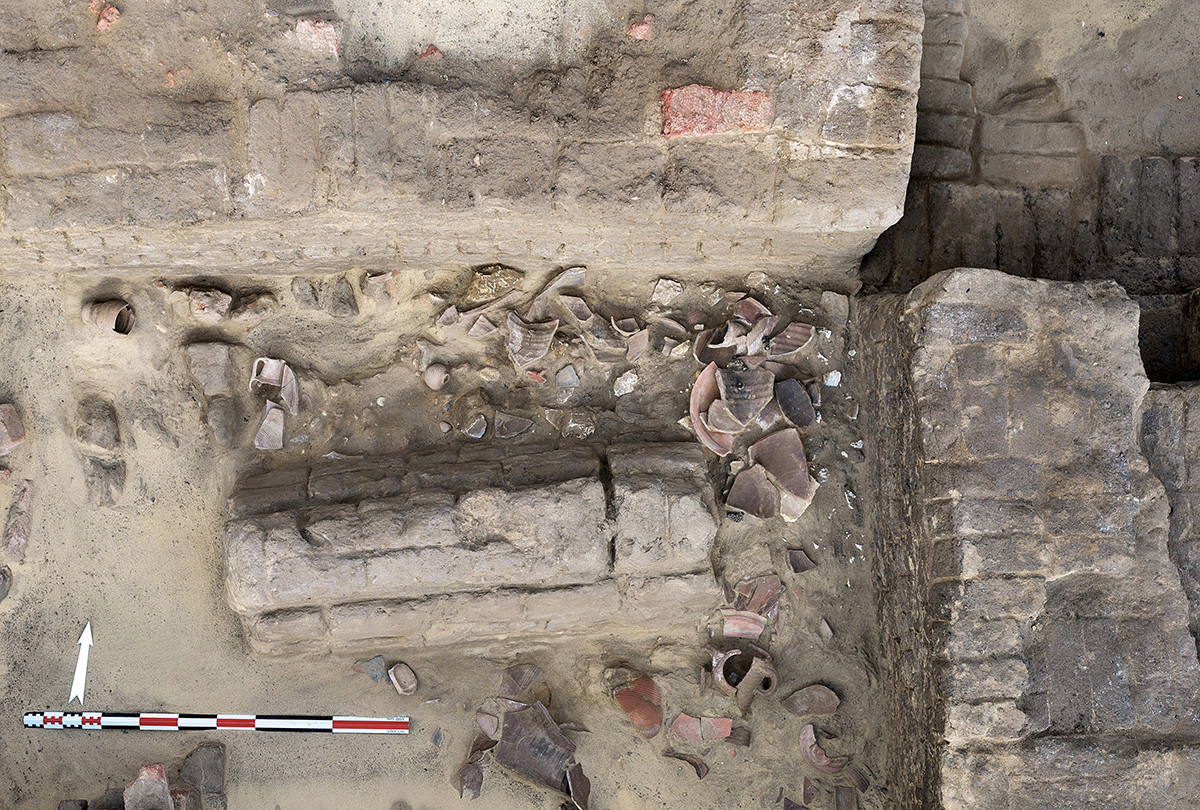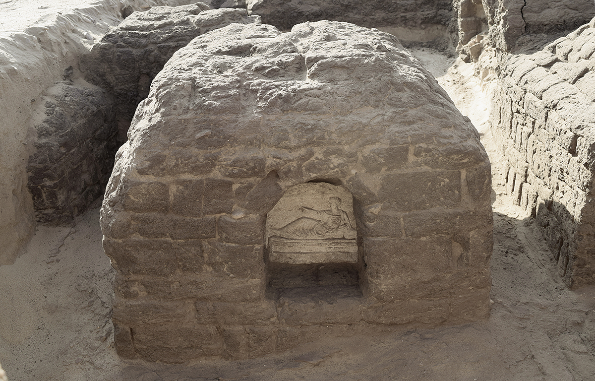 Surveying has shown that the western and northern fringes of the site present no traces later than the Roman period. The nature of the ceramic material, the bone material present and the numerous fragments of painted plaster have led to the identification of this area as a necropolis, a hypothesis confirmed by magnetometric surveying. The tombs excavated since 2014 date to the Roman period, being divided into three phases between the 1st and 4th centuries AD. Occupation then was very dense, with numerous tombs being reused. Built of mud-brick, they show a similar form: their brick superstructure is of variable shape, with a niche being in the façade which includes a funerary stela and an offering table.