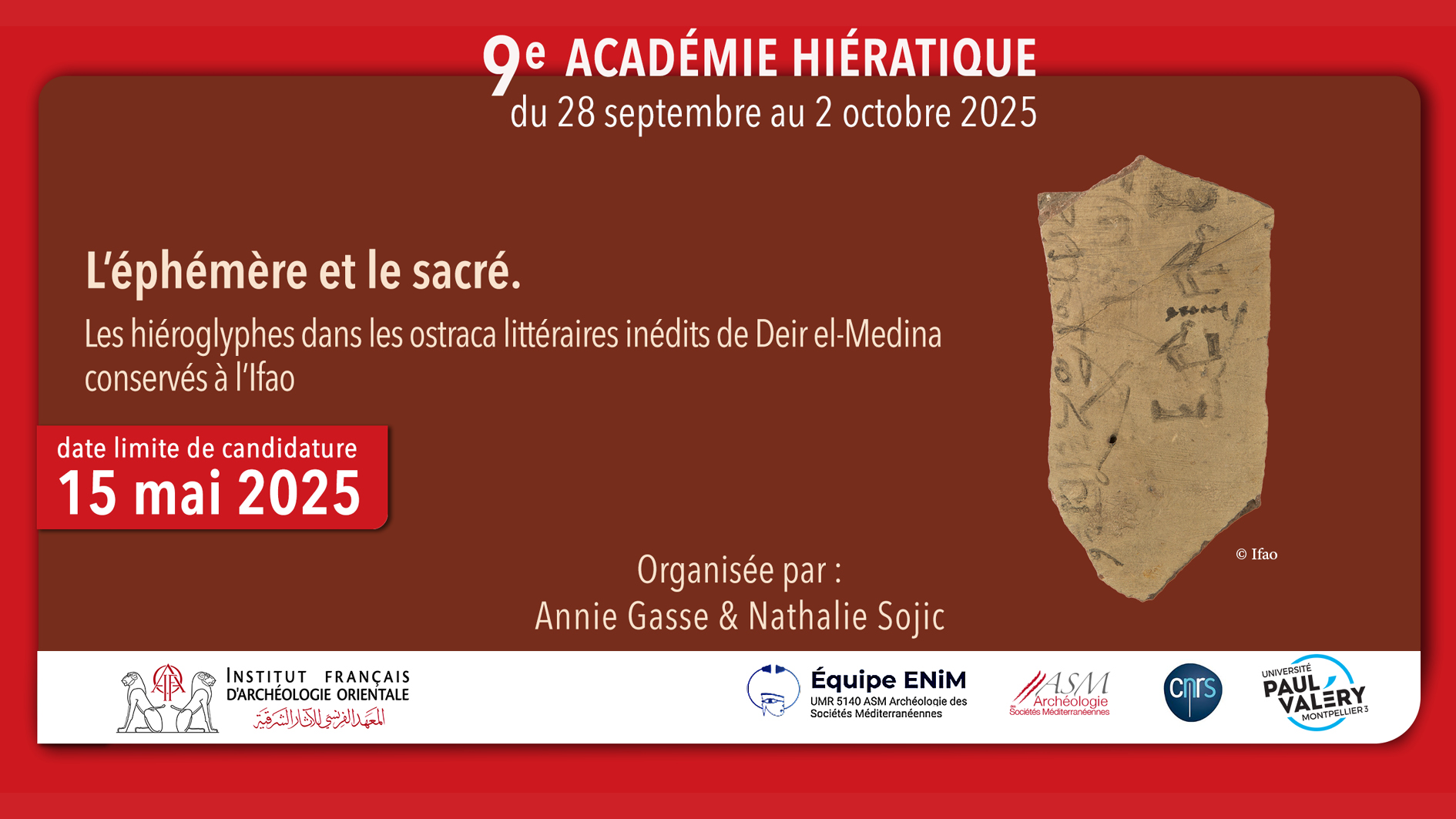 Du 28 septembre au 2 octobre 2025, Les académies de l'Ifao pour jeunes chercheurs par Annie Gasse et Nathalie Sojic: 9e Académie hiératique : L’éphémère et le sacré. , en partenariat avec l’ENiM, UMR 5140 – ASM, Université Montpellier 3 [en savoir plus] |