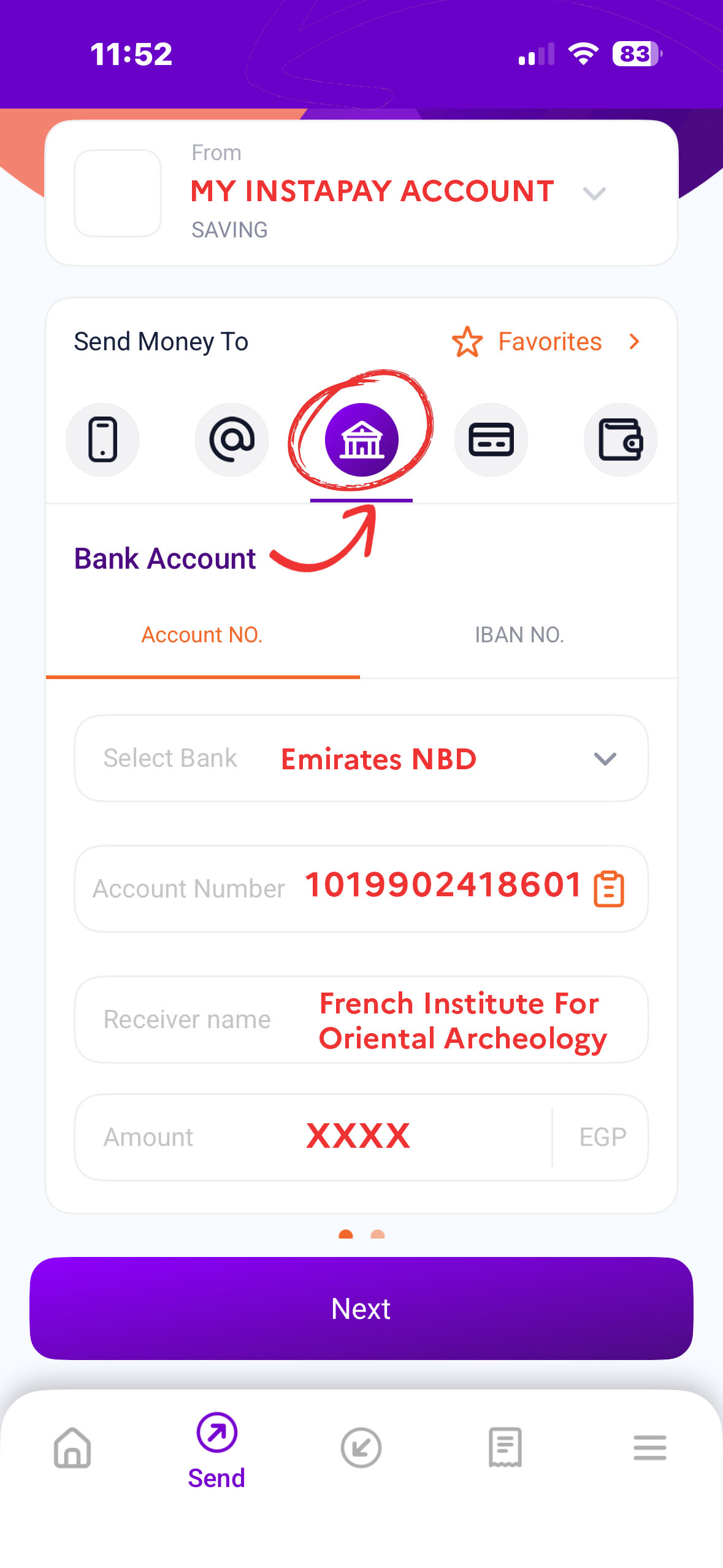 1- Sur la page d'envoi, choisissez 'Bank Account'2-Bank (menu déroulant): Emirates NBD3- Account number : 10199024186014- Receiver Name : French Institute For Oriental Archeology5- Remplissez le montant souhaité en Livres Égyptiennes.