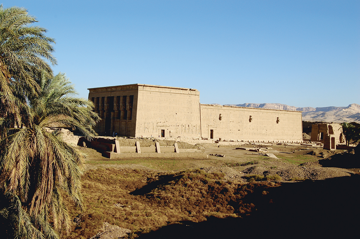 Dendara est incontournable au regard du patrimoine monumental des derniers grands temples égyptiens. Le sanctuaire majeur a été entrepris en juillet 54 av. J.-C., sous le règne de Ptolémée XII (80-58 et 55-51 av. J.-C.). Son programme n’a jamais été totalement achevé – à l’exemple du temple d’Horus à Edfou –, puisqu’il manque les dispositifs architecturaux précédant les espaces les plus sacrés d’un grand sanctuaire de cette époque, à savoir un pylône et une cour. Ces éléments sont restés à l’état de chantier au niveau des fondations, à l’exception de la partie arrière du mur péribole qui a été démantelée à une période secondaire, les autres composants – naos (au cœur duquel résidait la divinité) et pronaos – sont quasi intacts. Ils abritent l’agencement de plus d’une cinquantaine de pièces sur plusieurs niveaux.