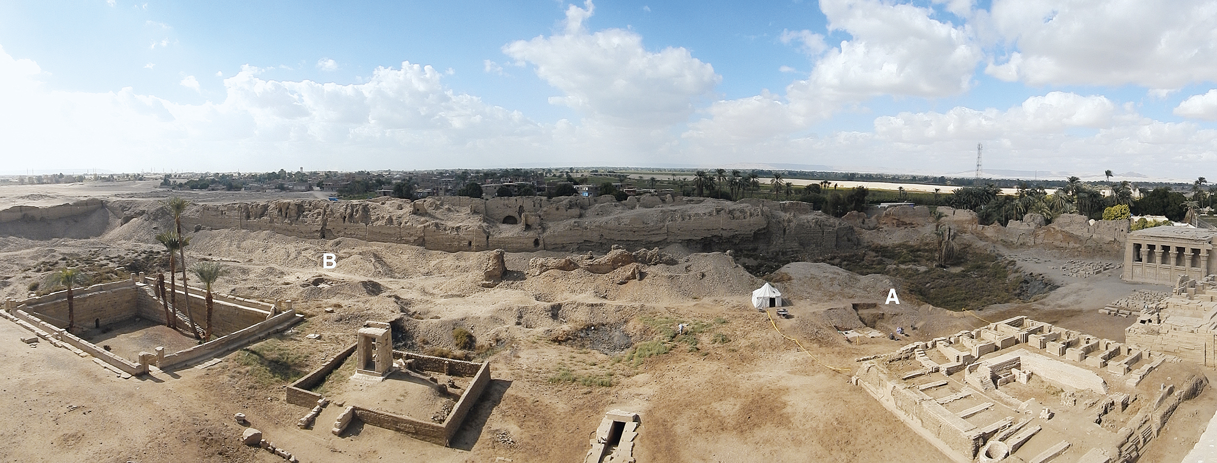 كان توطين التكتُّل السكانيّ على أطراف صحراء وادي النيل من شأنه حمايتُها من الفيضان. هناك مجمعان دينيَّان كبيران يُحدِّدان حيِّز مناطق المساكن. يضمُّ الأول (وهو الذي نزوره) معبد الآلهة الرئيسة، ولكن أيضًا توجد آثار إضافية