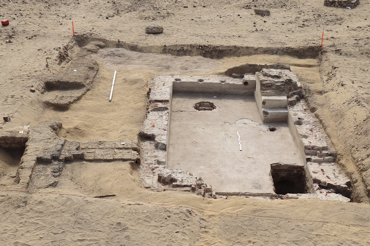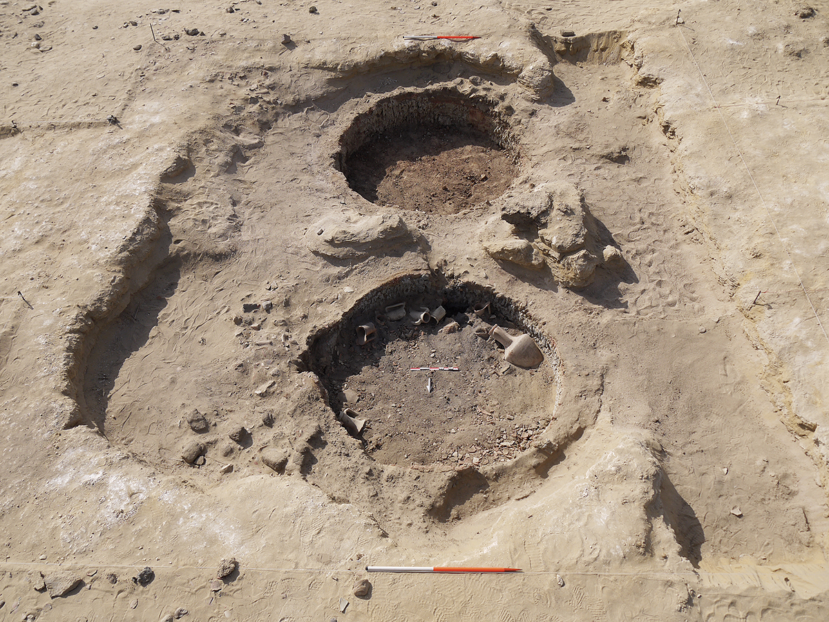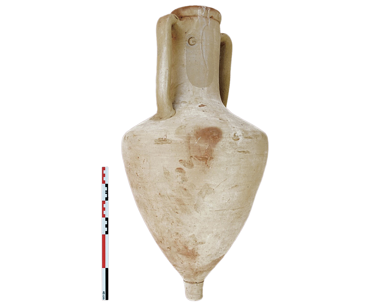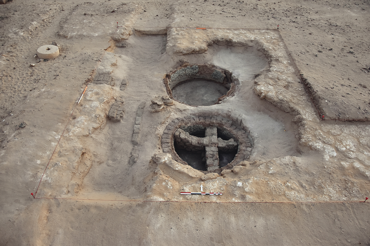 In the south zone, surface cleaning rapidly reached the bedrock. Excavation in the two neighbouring sectors revealed foundation trenches dug into the bedrock which were aligned north-south and east-west, which confirms the orthogonal plan drawn on L. Borchardt’s sketch for this part of the site. A set of two kilns can be assigned to the second half of the 3rd century BC, according to dating provided by numerous ceramic items, including a complete amphora. According to the presence of unbaked clay, this is the most ancient evidence for production in the Fayum of amphorae imitating the Rhodian style.