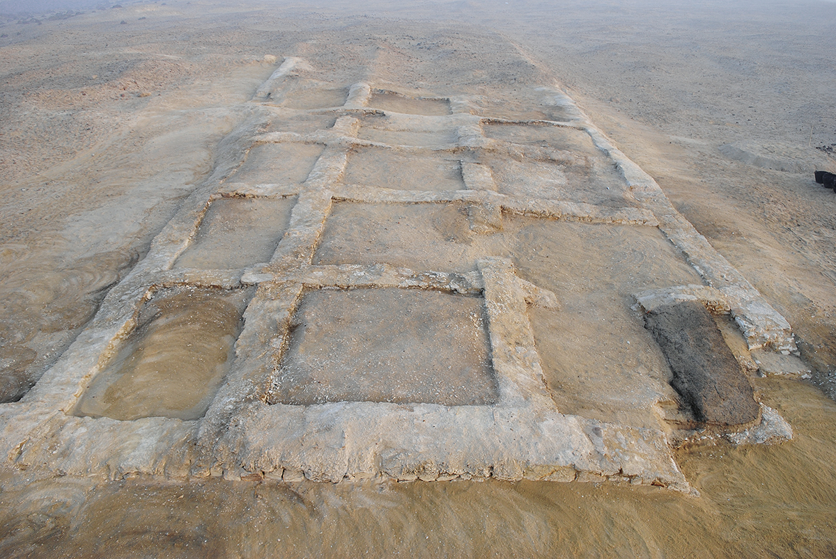 In the northern zone of the site, our efforts disclosed two structures: an impressive architectural complex as well as a water pool. To the west, the complex seems to extend as far as the vicinity of the ancient canal, and could have functioned as a warehouse. The pool could have been a fishpond. An initial survey at the southern limit of the area revealed remains of mud-brick elevations suggesting a wall. To the north of this linear structure, which leads towards the Nile Valley, is a series of ancient limestone quarries which probably provided material for the settlement buildings.